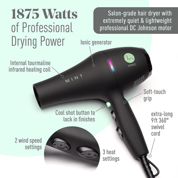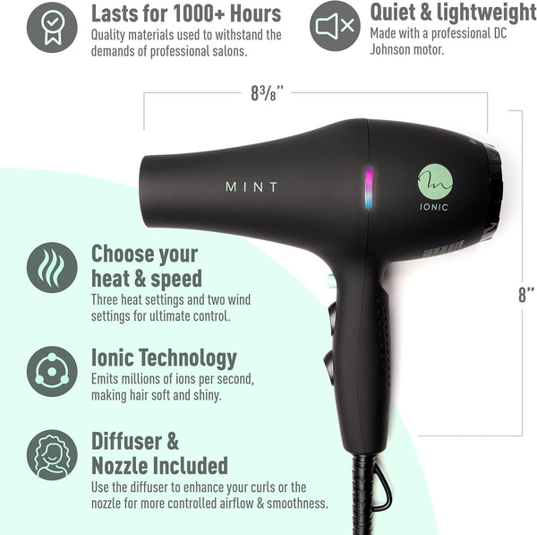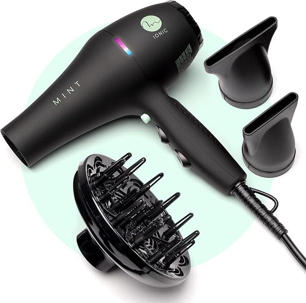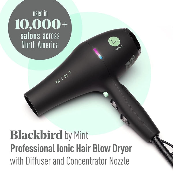 This Mint Blackbird professional blow dryer will leave your hair feeling amazing! The revolutionary iconic dryer creates maximum ion concentration for the most professional looking blowouts. The negative ion stream cancels static and quickly seals cuticles to retain hair natural moisture, reduce frizz and enhance shine.
